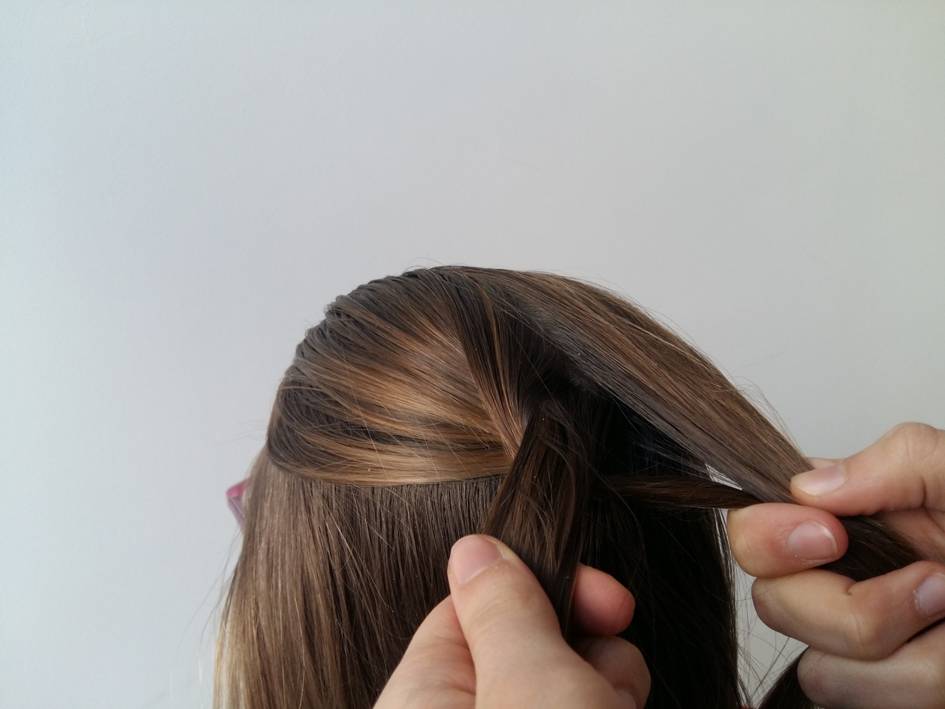- Z levé poloviny oddělíme tenčí pramínek a SPODEM ho přiložíme k pravé části.