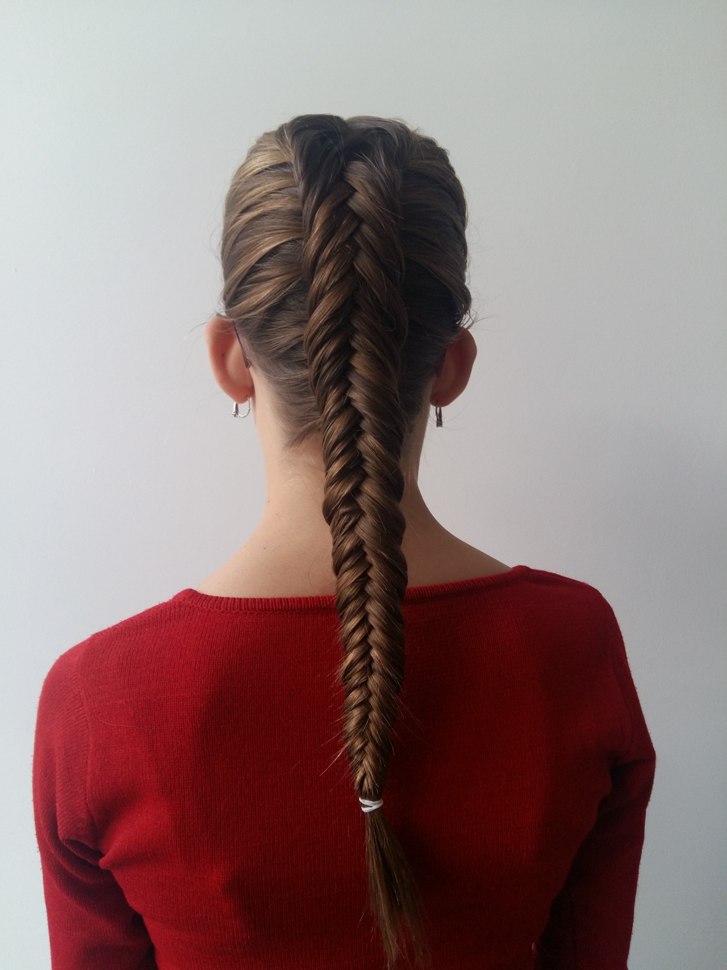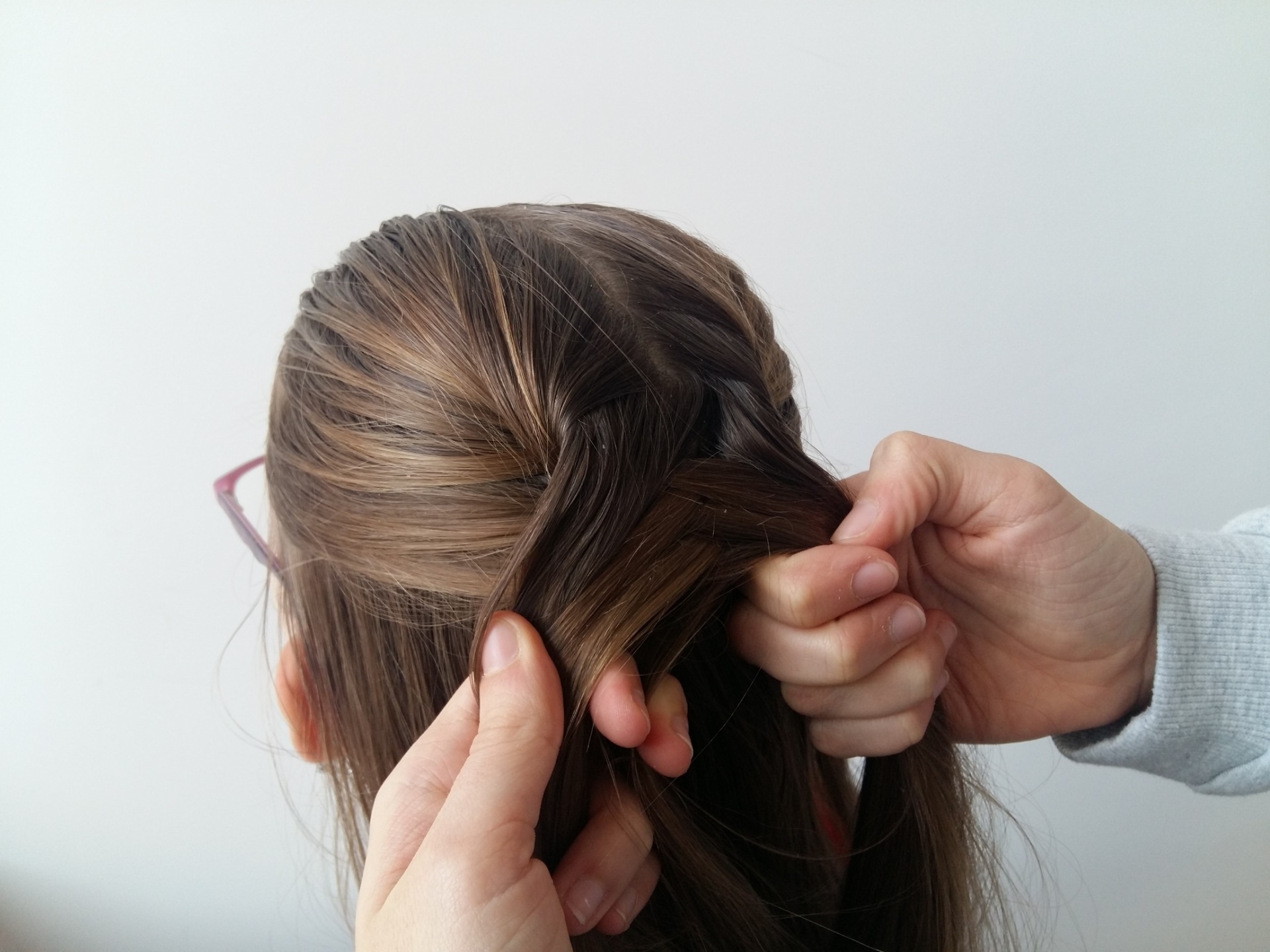 - Tímto způsobem dopleteme vlasy do konce hlavy a pak pokračujeme obráceným rybím copem bez přidávání.